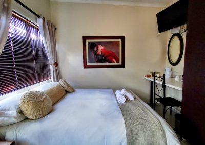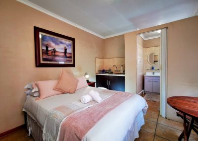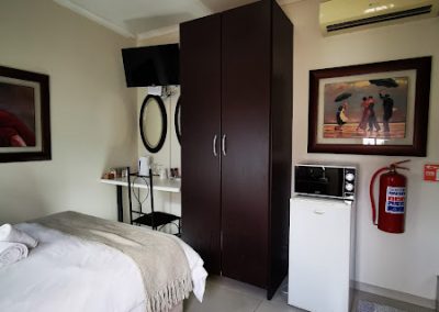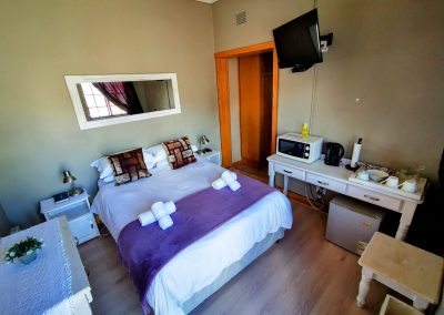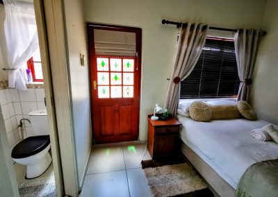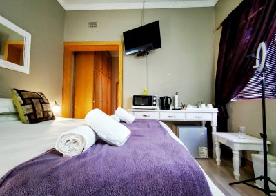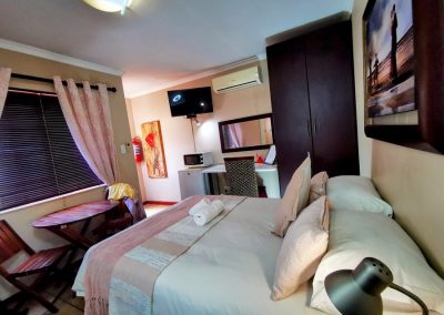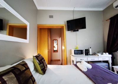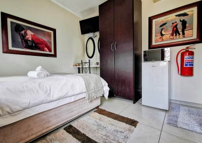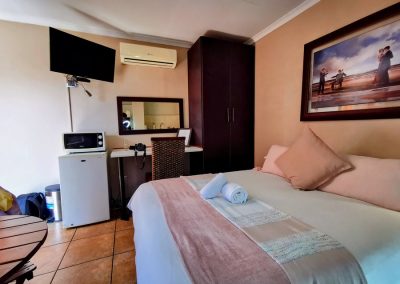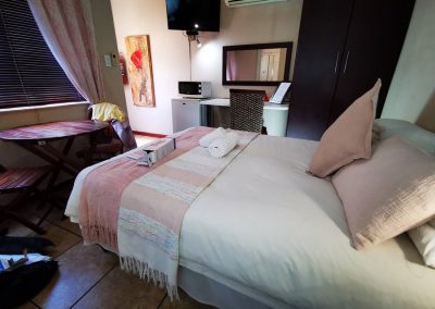 These double rooms are furnished with a double bed and an en-suite bathroom with a shower/bath. The room is equipped with a microwave, a bar fridge, cutlery and crockery as well as tea/coffee making facilities. The room also has a TV with selected DStv channels and free WIFI.