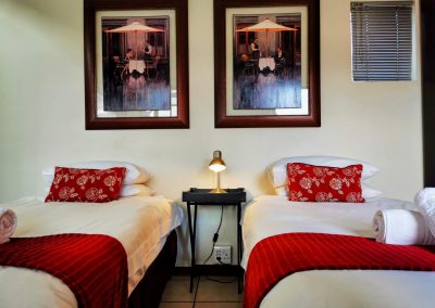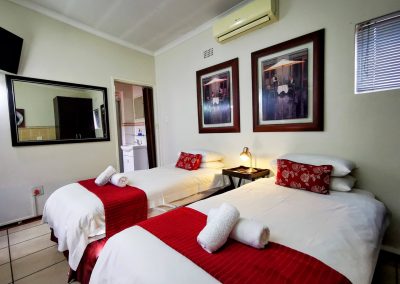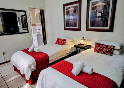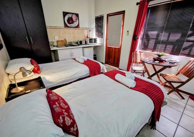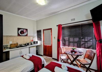 This double room is furnished with single beds and an en-suite bathroom with a shower/bath. The room is equipped with a microwave, a bar fridge, cutlery and crockery as well as tea/coffee making facilities. The room also has a TV with selected DStv channels and free WIFI.